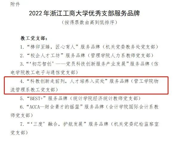 根据《中共浙江工商大学委员会关于深化基层服务型党组织建设开展支部服务品牌创建活动的通知》要求,在各二级党组织推荐的基础上,经过评选、学校党委会研究,pg电子模拟器 物流教工党支部获评“2022年浙江工商大学优秀支部服务品牌”!