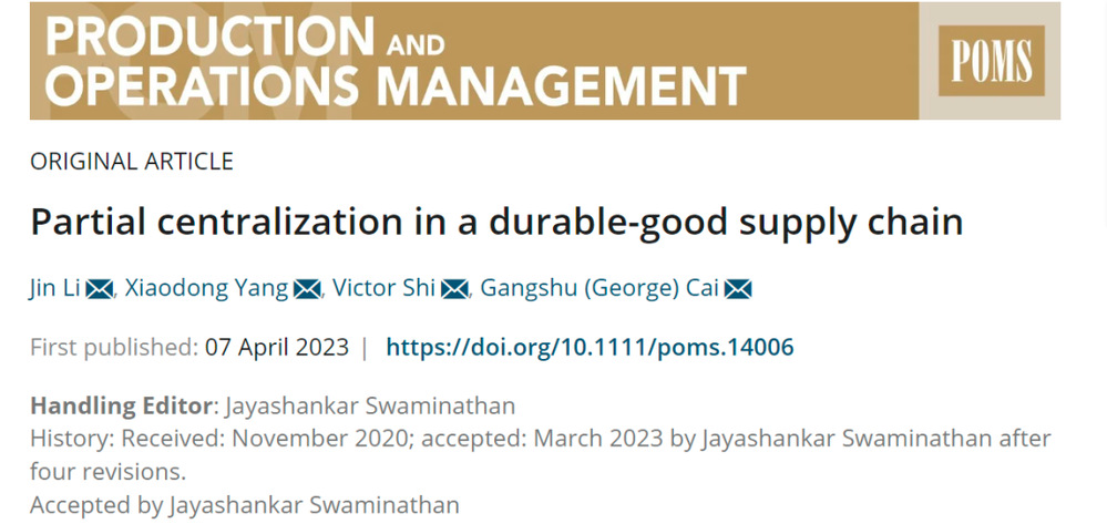 近日,我校李进教授作为第一作者的学术论文《Partial Centralization in a Durable-Good Supply Chain》在管理科学和管理学领域顶级期刊《Production and Operations Management(POM)》发表,合作者为: Xiaodong Yang(上海对外经贸大学)、Victor Shi(Wilfrid Laurier University)和Gangshu (George) Cai(Santa Clara University)。该研究成果实现了我校在国际顶级UTD期刊以第一作者发表论文零的突破。