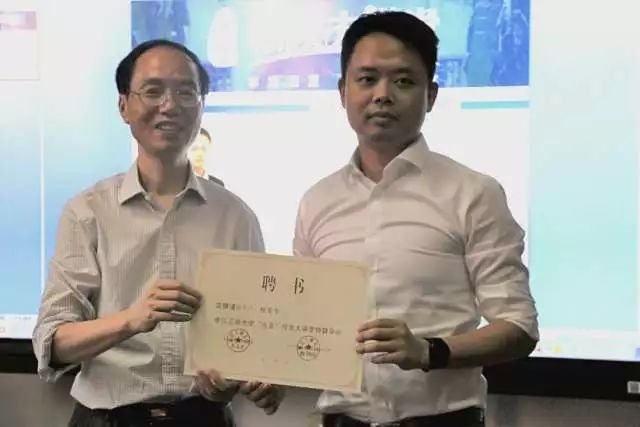 在讲座开始前,傅培华代表学校向钱晟磊校友颁发了“出蓝”校友大讲堂特聘导师证书。