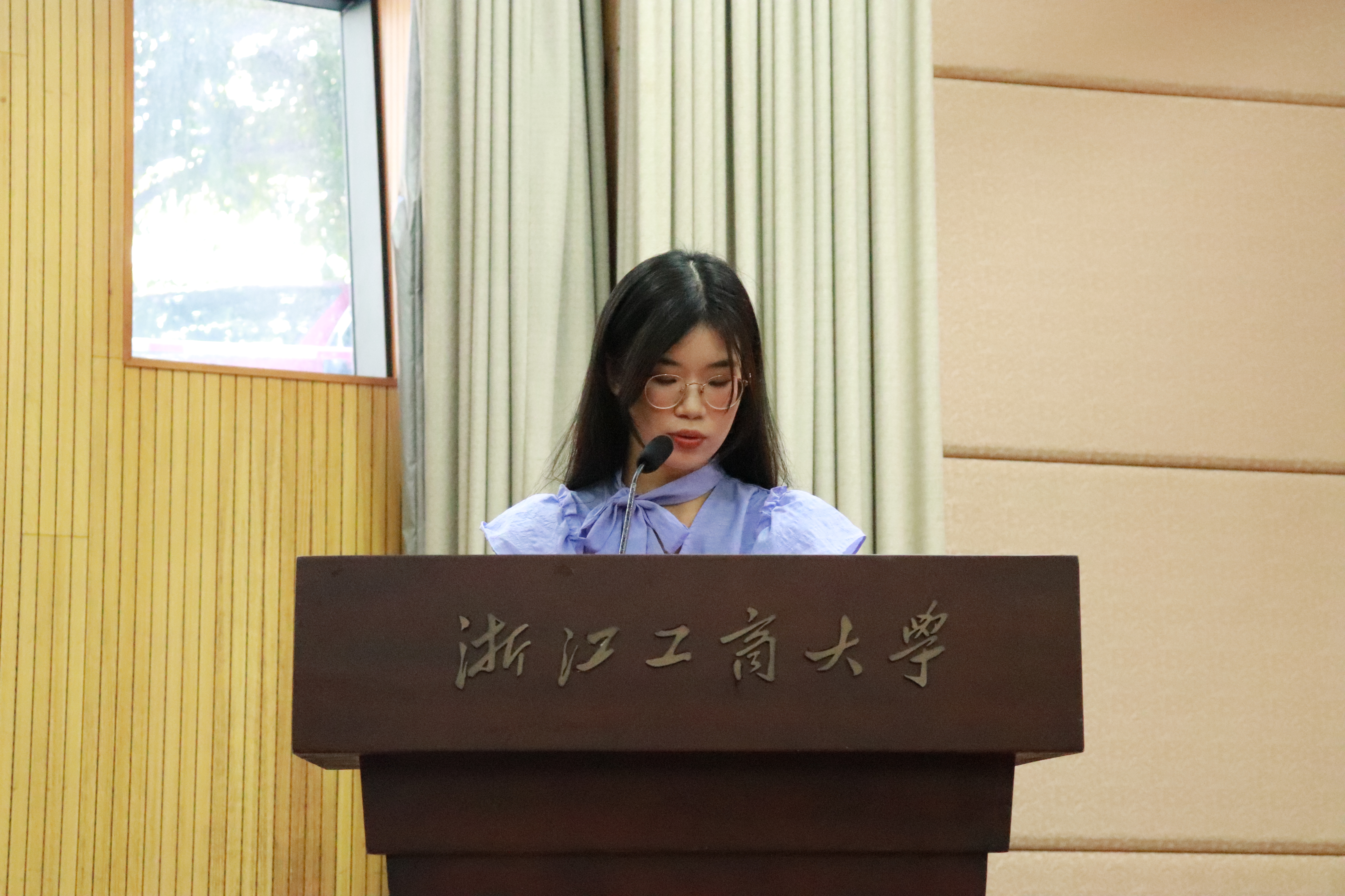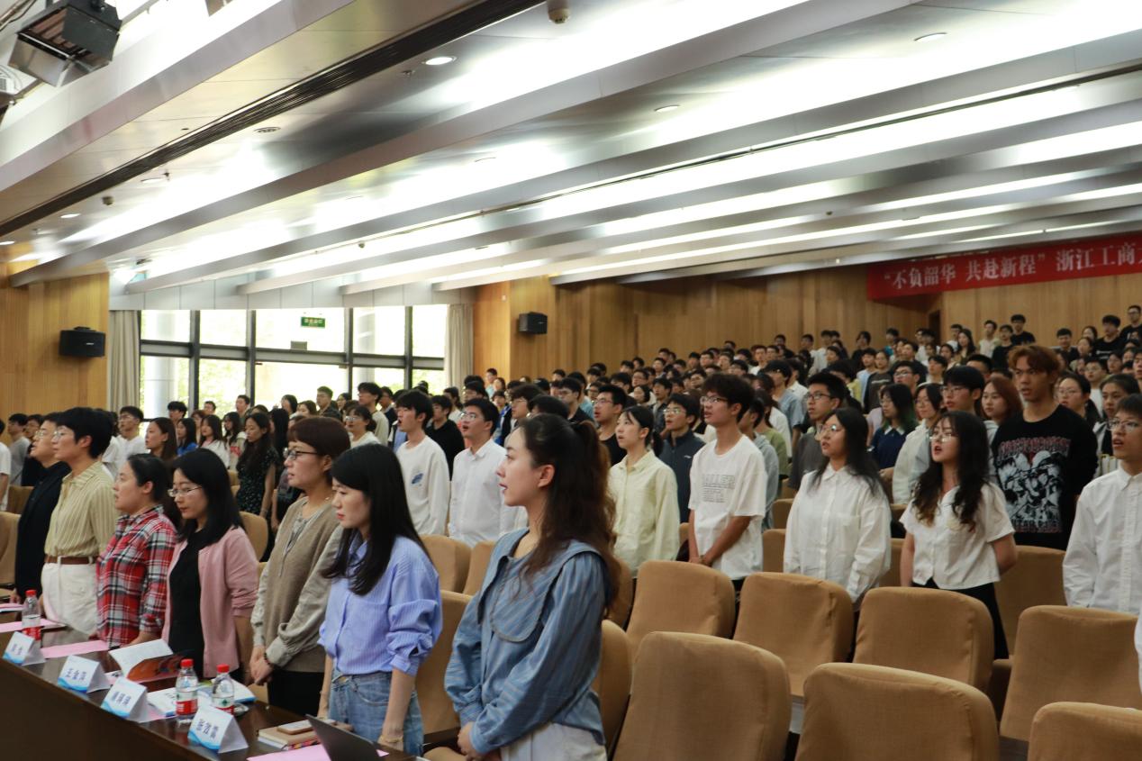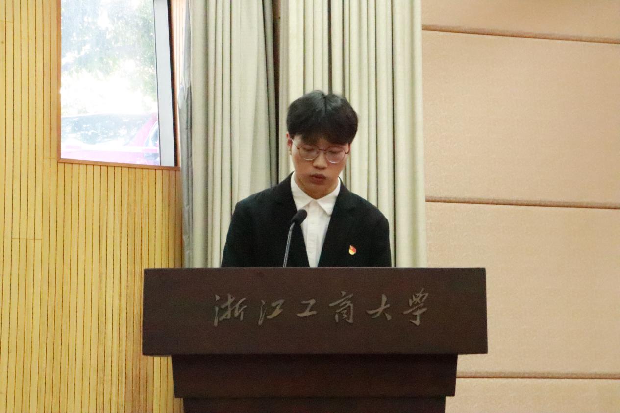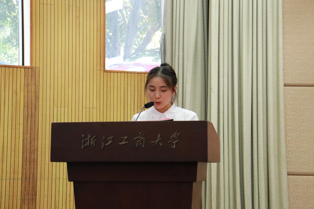 商务创新2301班陈怡蒙同学代表本科新生发言,她号召大家用最美好的青春岁月,在浙工商坚持热爱、心怀感恩、坚定目标,以梦想作舟,勇闯急流险滩,以奋斗为笔,共谱璀璨新篇。