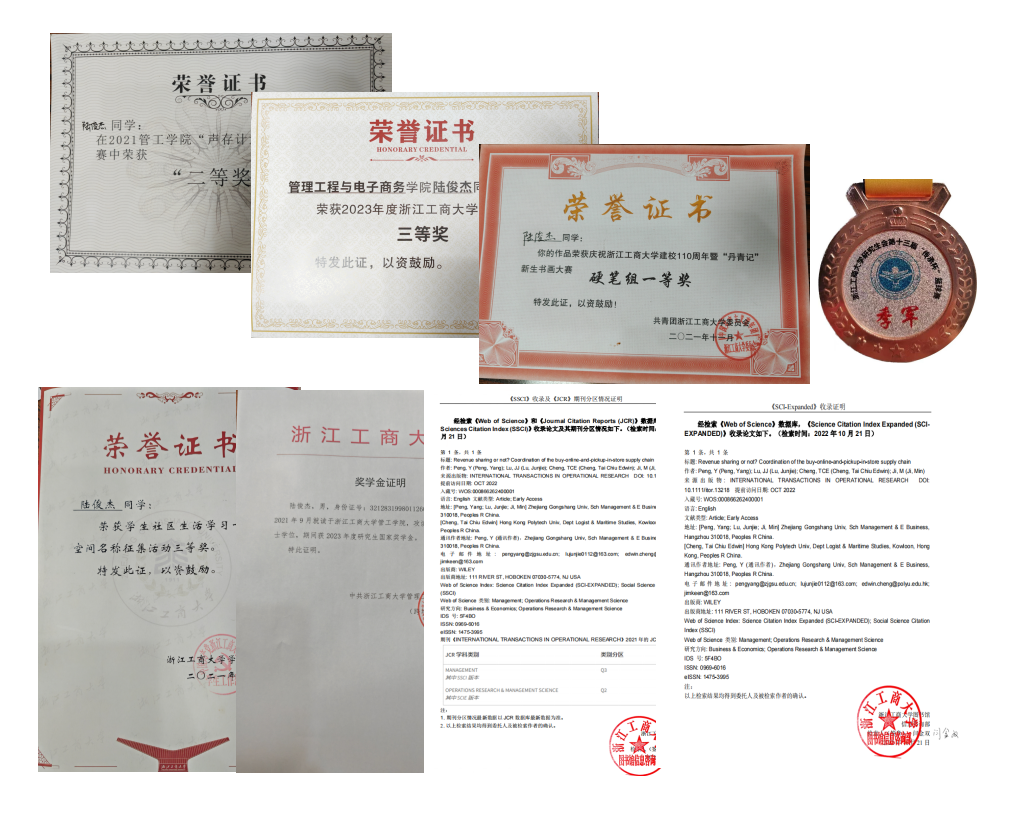 陆俊杰,pg电子模拟器 物流工程与管理专业21级研究生。入学以来,在导师的带领下,致力于全渠道零售和医药供应链方向的研究,获得2023年度研究生国家奖学金和学业一等奖学金。在2022年10月,以导师一作,本人二作的身份在期刊INTERNATIONAL TRANSACTIONS IN OPERATIONAL RESEARCH(SCI二区,SSCI三区)上发表论文一篇;也曾参与国家社科基金项目,负责全渠道零售专著撰写。在研究生就读期间,借助学校这个优秀的平台,参与了诸多文体艺竞赛,获得过校研究生数模比赛三等奖,建校110周年书画大赛硬笔字一等奖,研究生篮球比赛季军,学校征名活动三等奖,pg电子模拟器 歌唱比赛二等奖等荣誉。在社会实践方面,曾于2022年暑期在江苏华为医药物流有限公司实习调研,也曾利用假期时间参与文明城市创建交通引导志愿服务和关爱留守儿童志愿服务等,在锻炼自身的同时也是回报社会的一种方式。通过怀揣着对知识的不断渴求,借助研究生阶段较为丰富的经历,即将在毕业后入职国企。