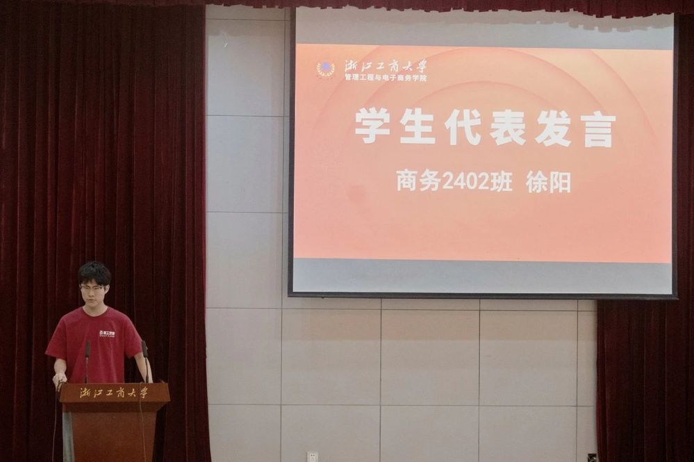 来自商务2402班的徐阳同学作为新生代表发言。他鼓励大家珍惜大学时光,努力学习,不畏挑战,以奋斗为笔,共谱璀璨新篇!