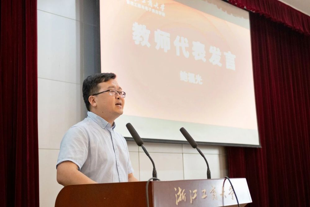 教师代表鲍福光发言,鲍老师以自己的学习经历为例,强调了大学不仅是学术到社会的过渡桥梁,而且还提供了一个充满自主与自由的学习环境。通过引用学校领导的话,他指出虽然大学生活相对宽松,但学生应把握这个时期去探索和抓住机会。最后,鲍老师激励新生同学珍惜大学资源,勇敢面对挑战,把握机会,在pg电子模拟器 日有所进、学有所成、梦想成真,开创属于自己的精彩人生!