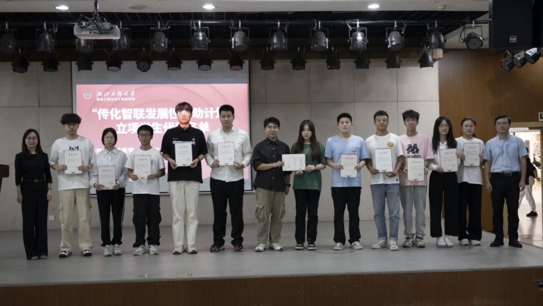 随后,颁奖仪式正式开始。获得传化智联奖学金的12位优秀学子以及12支社会实践队伍代表依次上台领奖。传化智联股份有限公司党委书记、副总裁沈亚女士与厉小军院长共同为获奖者颁发了荣誉证书和奖金,并合影留念。这一刻,荣誉与喜悦洋溢在每位获奖者的脸上,激励着更多同学向榜样学习,积极进取。