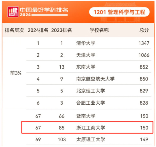 10月15日,高等教育评价专业机构软科正式发布“2024软科中国最好学科排名”。浙江工商大学管理科学与工程学科排名从85位跃升至第67位,居全国前30%。