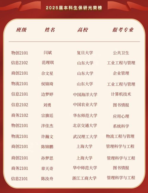 在这金秋送爽的季节里,我们迎来了一年一度的保研季。经过不懈的努力和激烈的竞争,我校2025届的部分优秀学子成功获得了国内知名高校的保研资格,展现了他们卓越的学习能力和综合素质。在此,我们向所有获奖同学表示最热烈的祝贺,并希望通过他们的事迹激励更多的同学追求学术梦想,勇攀高峰!