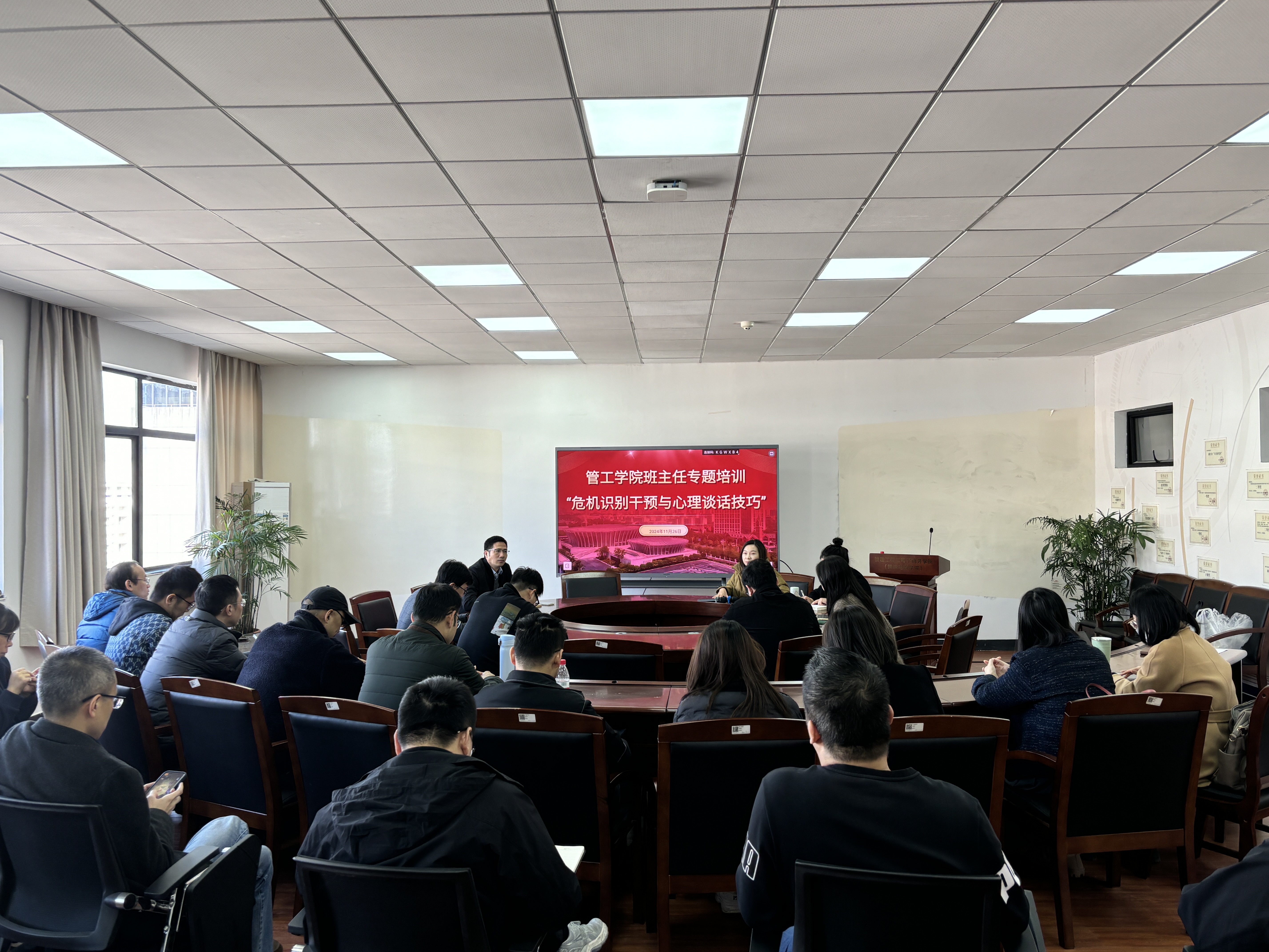 随后校心理中心周钱老师为与会班主任带来了一场题为“危机识别干预和心理谈话技巧”的专题培训。周老师通过生动的案例分析和实用的操作技巧,深入浅出地讲解了如何识别学生的心理危机信号,以及在与学生进行谈话时的有效沟通技巧。这场培训对于提升班主任的心理健康教育能力具有重要意义。