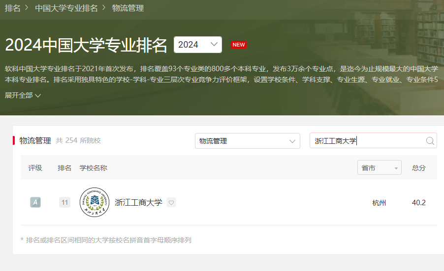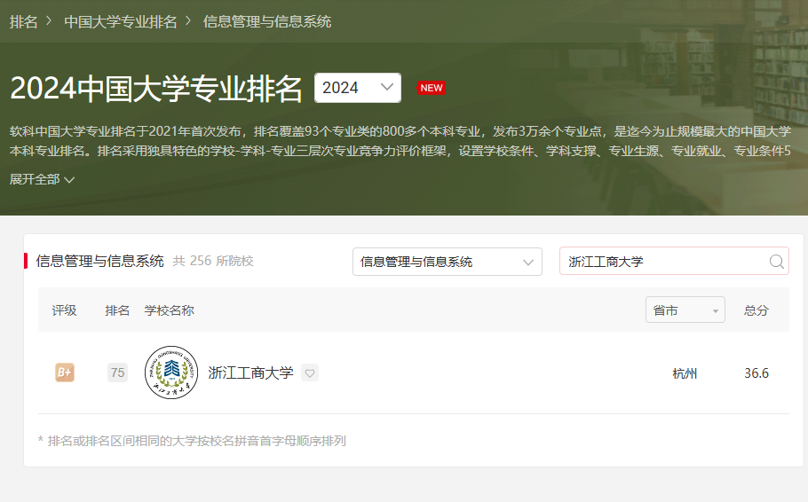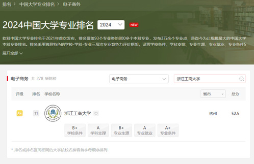 2024年6月13日,高等教育专业评价机构软科正式发布“2024软科中国大学专业排名”,排名包括810个专业,涉及93个专业类、12个专业门类。软科中国大学专业排名是迄今为止覆盖专业数量最多、参评专业规模最大的中国大学本科专业排名。浙江工商大学pg电子模拟器 三个专业均为上榜专业,其中电子商务专业排名层次为A+,排名名次第11,较去年上涨4位;物流管理专业排名层次为A,排名名次第11,较去年上涨8位, 信息管理与信息系统专业排名较去年上涨10位,排名档次B+。